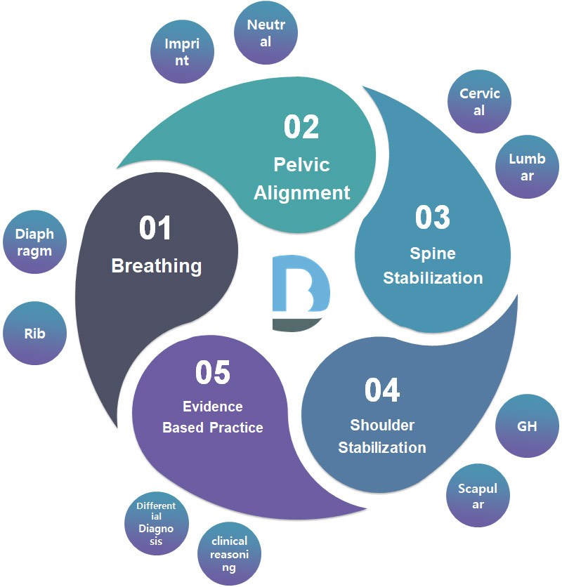기본원리는 총 다섯 가지의 원리로 구성되며 각 원리마다 2가지의 하위 원리를 포함하여 총 10가지의 원리로 이루어진다. 이러한 원리를 바탕으로 한 운동을 통해 신체 균형과 올바른 움직임을 만들며 건강증진은 물론 근골계 질환의 치료와 재활을 이룬다.