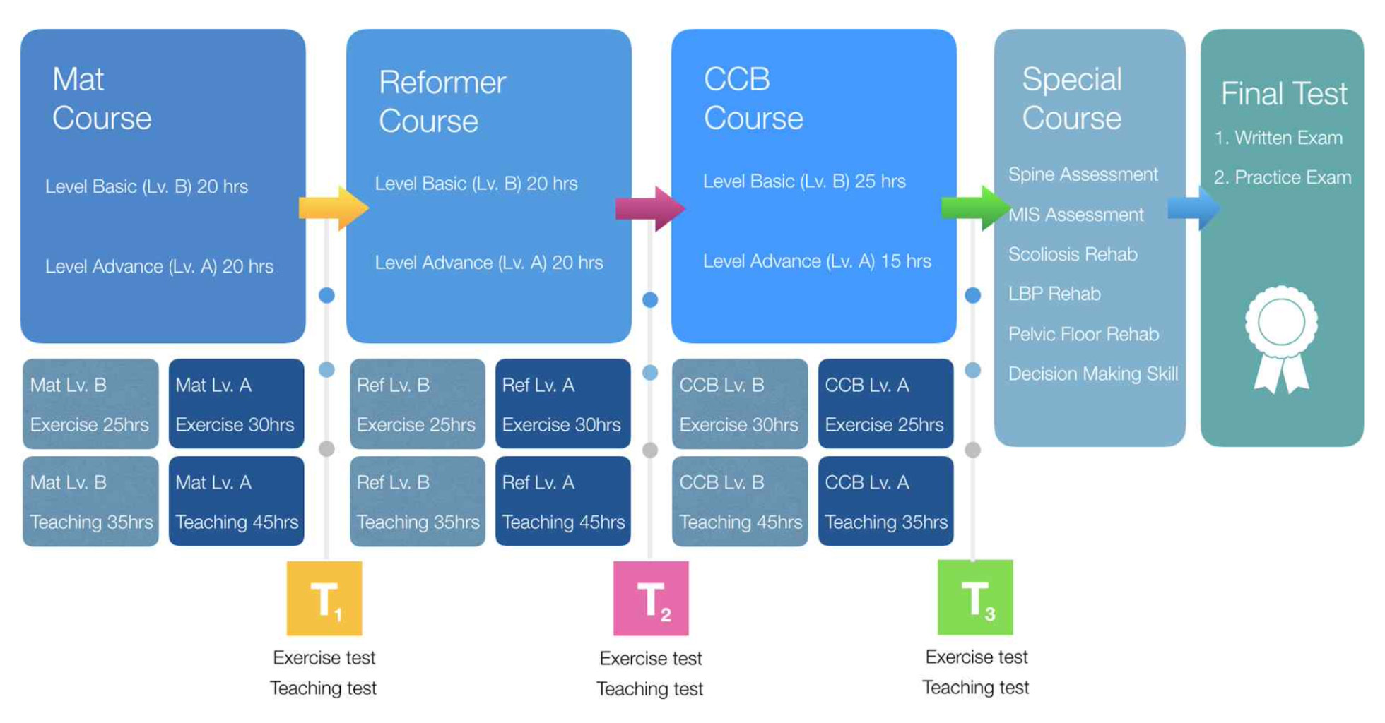 모든 한 교육과정에는 강의(lecture), 개인 운동 연습(personal practice)과 티칭 연습(teaching practice) 시간이 포함됩니다. 개인 운동 연습 및 티칭 연습 시간은 수업 시간 외에 기록되어야 하며, 기록지를 각 시험 전에 제출하여야 합니다. 각 교육과정마다 Exercise test와 Teaching test가 있습 니다. 매트, 리포머, 캐딜락-체어-배럴을 마친 후 심화과정이 진행됩니다. 심화과정은 척추의 평가와 진단, 부정렬 증후군 평가, 평가 결과에 대한 의사결정 기술, 필라테스 프로그램 구성, 측 만증 재활, 요통재활, 골반저부 재활 등으로 구성됩니다. 모든 과정을 마치고 각 교육과정의 Exercise test와 Teaching test에 통과해야 최종 시험(Final test)의 자격조건이 주어집니다. 최종 시험 (Final test)인 이론 시험(Written exam)과 실기 시험(Practice exam)을 거쳐 Designed Body 필라테스 지도자가 됩니다.
